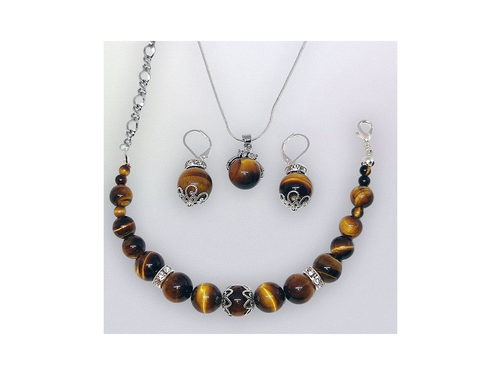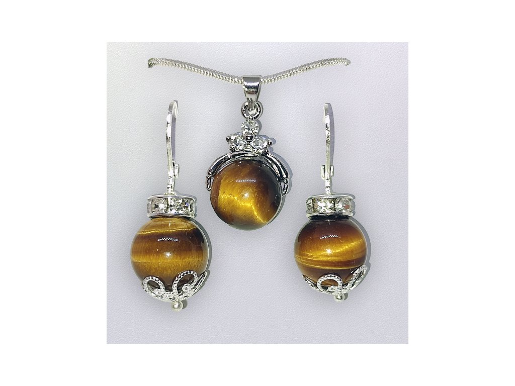 Souprava se skládá z kuliček Tygřího oka - přírodní Tygří oko s průměrem 12mm (běžná velikost býva 10mm) spodní část kuličky zdobený stříbrný filigrán (kytičkový vzor) a vrchní část rondelka se zirkony (broušené kamínky, které hodně odrážejí světlo a dodávají šperku třpyt). Zapínání je uděláno přes mechanickou klapku - čili patent který neztratíte (narozdíl od afroháčků).